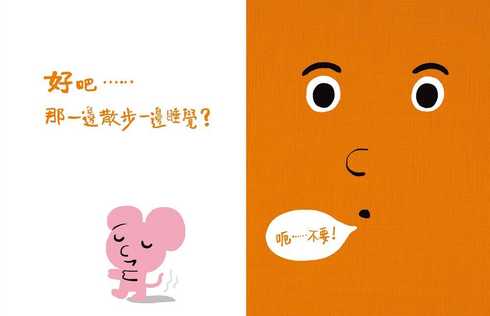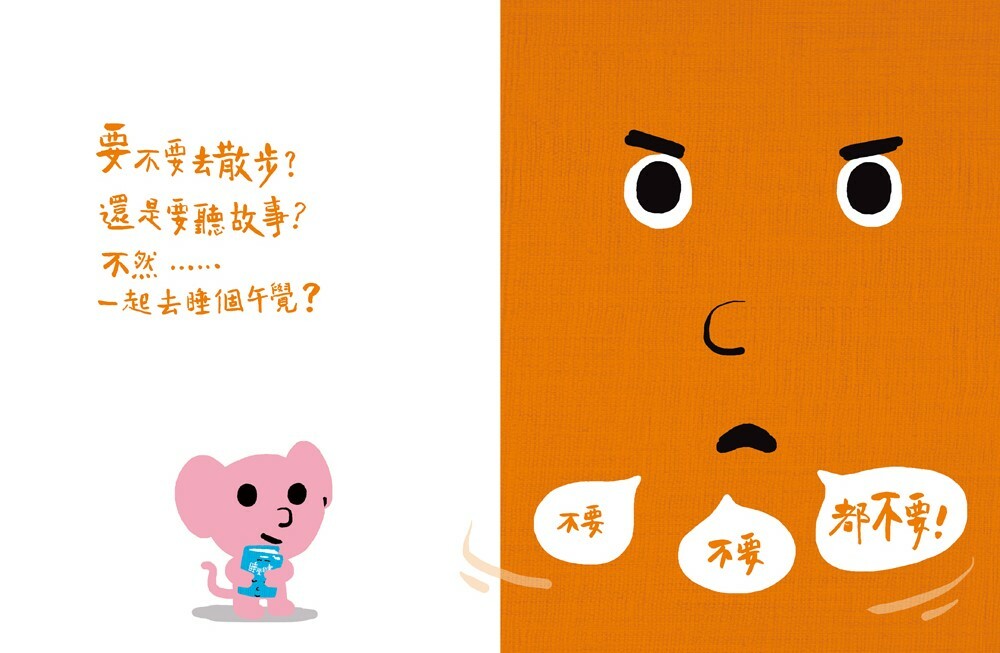 此時,圖畫書就是最佳的溝通橋梁!在《說不要的書!》中,孩子能觀察主角書在說「不要」時的態度和表情變化,彷彿見到自己的影子,可以單純感受彷彿無理的回應,令人好氣又好笑。再跟著小老鼠的正向情緒疏導語,用幽默的提問化解情緒僵局,給原本躁動的書一個大大的擁抱。而當書的情緒平撫下來之後,這時再重新思考剛剛說「不要」的提案,是不是發現這些點子其實也挺想「要」的呢?