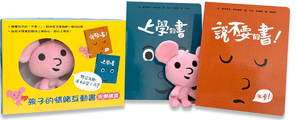 安撫禮盒內含《說不要的書!》和《上學的書》2本硬頁書,以及1隻全球獨家小老鼠布偶。觸感柔軟,也方便小小孩抓握,